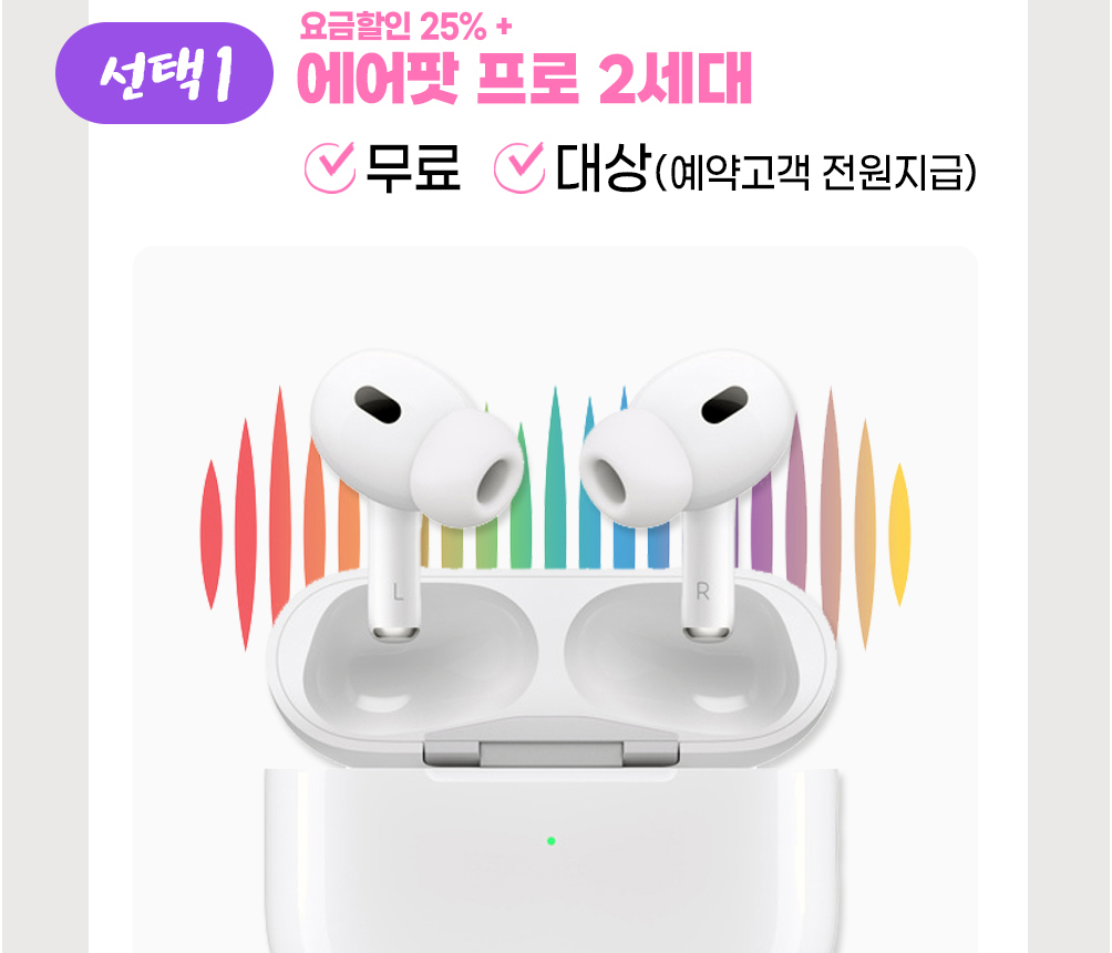 25%의 요금 할인혜택에 에어팟, 애플왓치, 기기값 추가 할인 혜택이 있습니다. 기본 액세서리 사전예약 고객에게 모두 지급되고요 추첨으로 80만원 상당의 에어팟맥스를 증정하는 이벤트도 있습니다. 이곳은 매번 사은품이 남달랐던 곳이라 믿고 추천할 수 있습니다. 기본적인 혜택은 어디서나 같겠지만 이렇게 임팩트 있는 사은품은 격이 좀 달랐던 곳입니다.