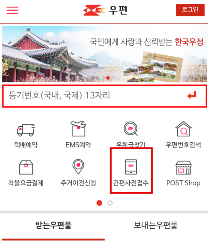 제일 처음 나오는 화면입니다. 등기와 택배를 조회할수 있고 주거이전신청, 착불요금결재 메뉴가 있어 우체국에 가지 않아도 다양한 일을 볼수가 있습니다. 아래에 빨간색으로 표시해 둔 "간편사전접수" 메뉴를 클릭하면 5% 할인을 시작하게 됩니다. 순서대로 클릭해 나가시면 됩니다.