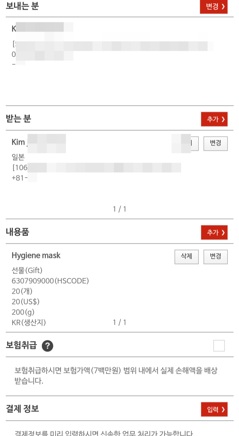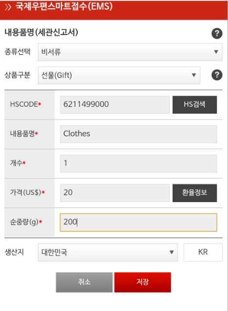 발송하는 내용품들 모두 입력해야 합니다.이곳은 내가 보내는 물건에 대한 세관신고로도 이어지므로 있는데로 작성해야 합니다.