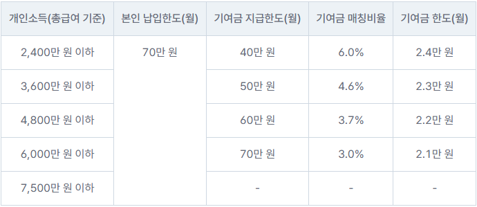 예를 들어 개인 소득 2400만원 이하인 가입자가 월 70만원을 납입할 경우 정부는 매월 2.4만원을 더해주는 구조입니다.