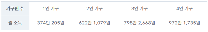 ※2023년 가구 중위소득 180%기준 금액입니다. 1인가구는 374만원 까지는 가입할 수 있습니다.