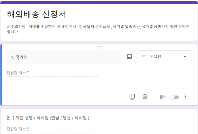 주문자의 인적사항을 남기는 곳입니다. 배송국가, 전화번호, 배송주소, 우편번호, 신청물품 등을 기록하면 담당자가 확인하고 혹시 문제가 될만한 물건이 있으면 말씀을 드립니다. 이 기록으로 배송주소를 입력하고 발송하기 전에 한 번 더 최종 확인을 거칩니다.